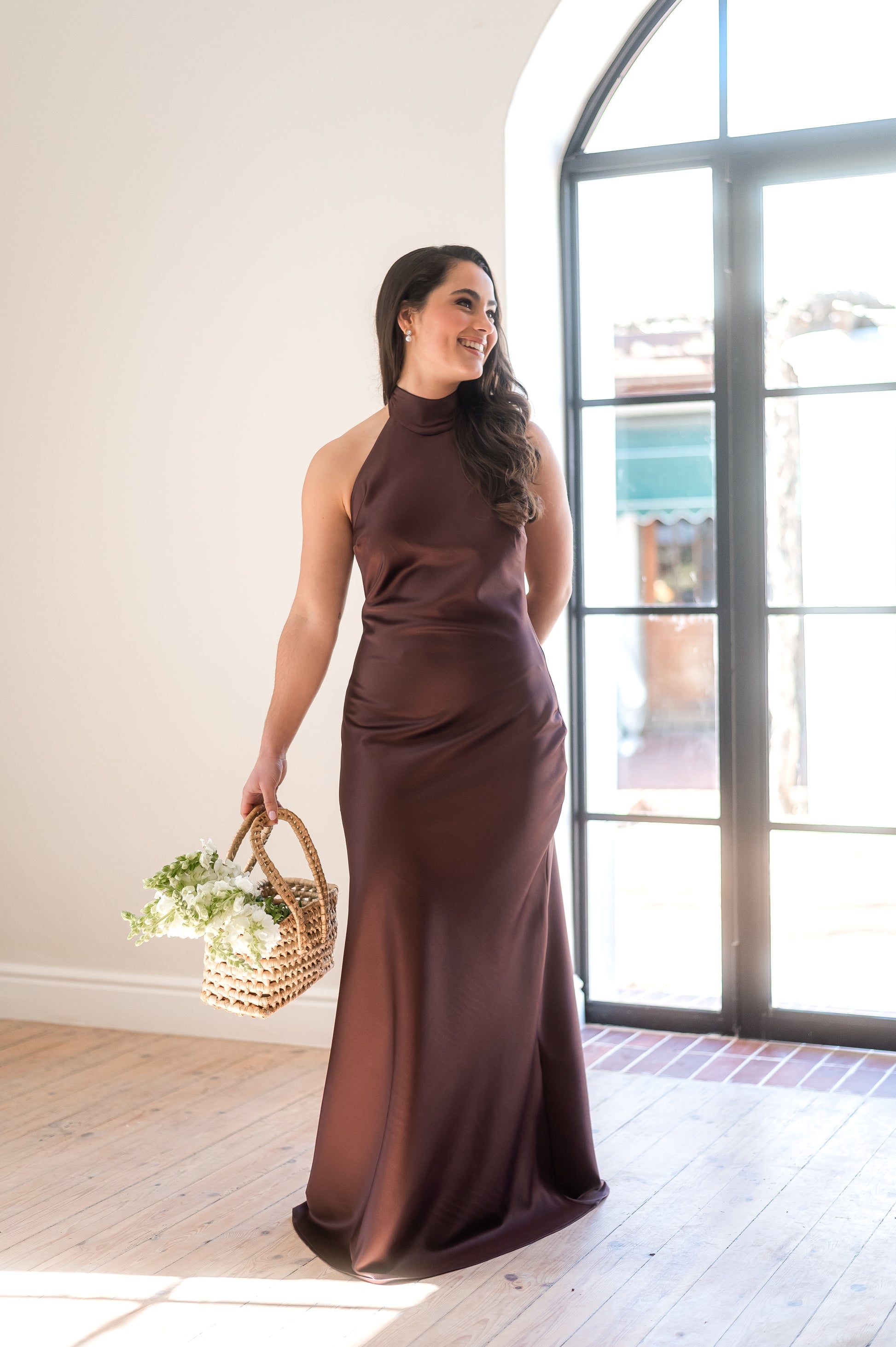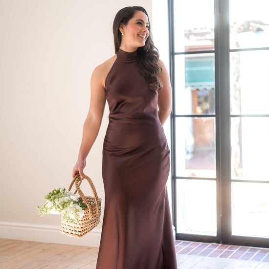 Halter neck, long-length bridesmaids dress.