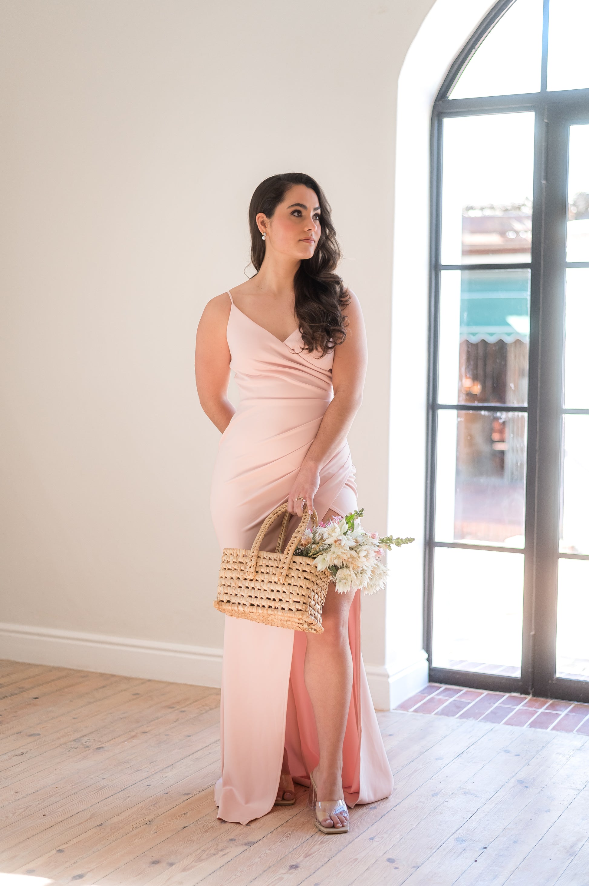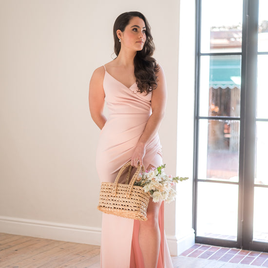 Thin strap, long-length bridesmaids dress.
