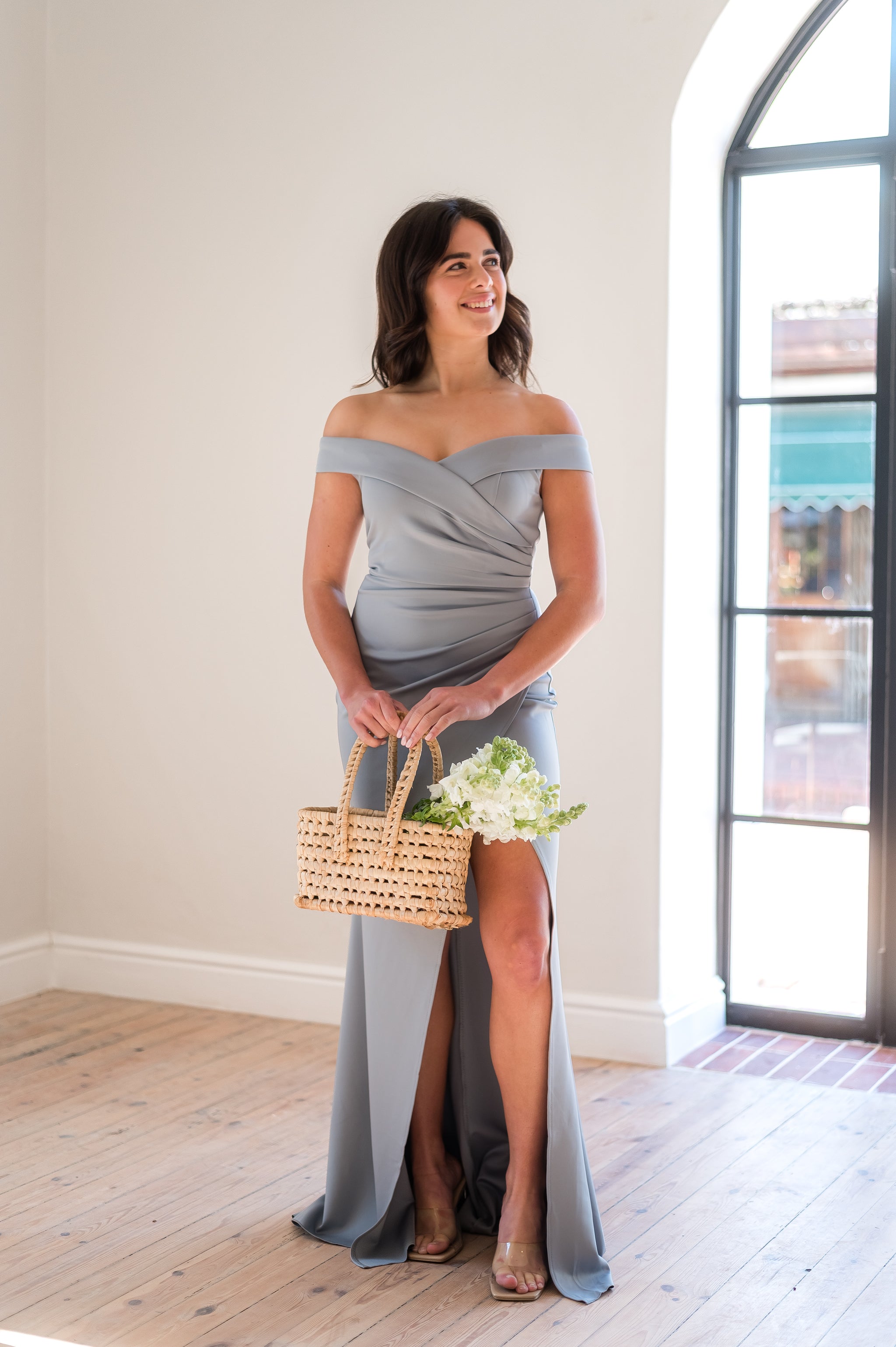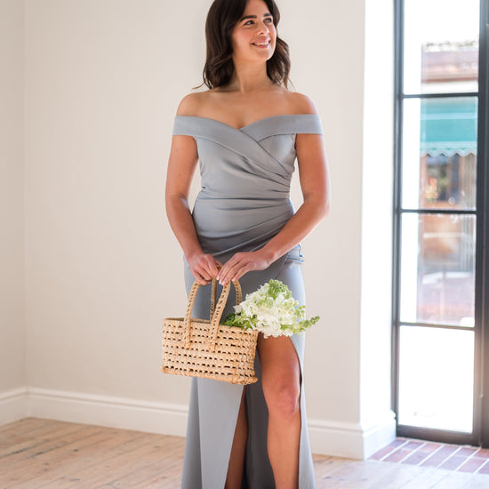 Off-shoulder, long-length bridesmaids dress.